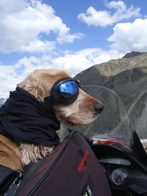 Gli occhiali che indossava Lola sono stati realizzati, in Germania, appositamente per i cani da slitta e per quelli che lavoravano sulla neve, come i cani del soccorso alpino. Ora sono fuori produzione. Lola li ha utilizzati esclusivamente per proteggere gli occhi dal sole, dal vento, dagli insetti e da tutto quello che poteva costituire un pericolo durante il viaggio in moto : erano un accessorio indispensabile per la sua salute. Lola utilizzava due tipi di occhiali : quelli con lenti azzurre schermanti (per le giornate di sole e per l’alta montagna) e quelli con lenti trasparenti (per la sera e la notte od in condizioni di scarsa luminosità), queste ultime realizzate appositamente con un materiale speciale anti riflesso. Lola è stata educata ad accettare ed indossare gli occhiali e, soprattutto, a tenerli durante il viaggio in moto : da cucciola li ha "abbinati" al piacere di andare in moto ed anche alla possibilità (senza essere “ripresa” dal conducente) di sporgersi, in totale sicurezza, dal parabrezza, per sentire "il vento sul muso".